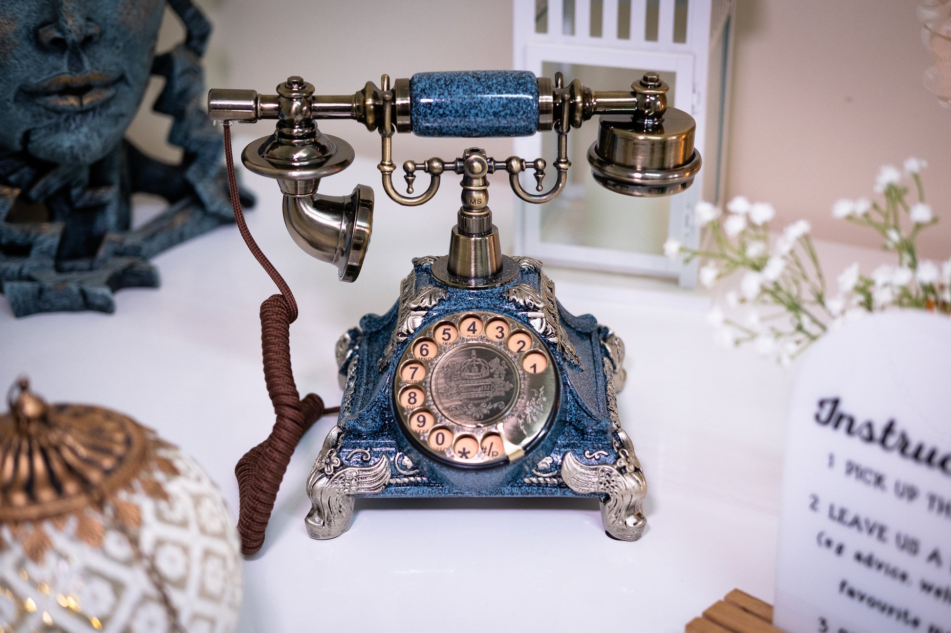 Introducing the Vintage Navy Blue Phone, a perfect blend of vintage aesthetics and modern functionality. With its elegant blue body, intricate rotary dial, and metallic accents, this phone exudes timeless charm. Elevate your wedding or special event experience with this exquisite blend of past and present.